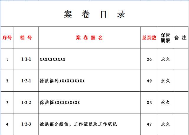 案卷目录中的序号、档号、案卷题名、总页数为必录项。
